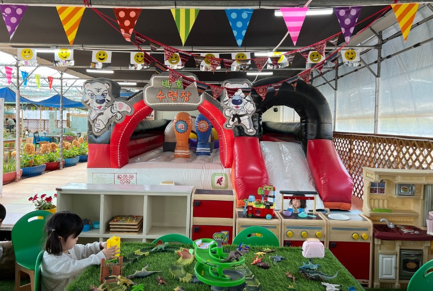 실내 물놀이 키즈카페 엘림랜드는 예약제로 운영한다.음료까지 포함된 성인 입장료가 7천원으로 저렴하며 비닐하우스안에 넓은공간이 기다림없이 자유롭게 즐길 수있어 좋다. 베이비전용 에어바운스,탈것,짐볼,베이비미끄럼틀 등 아이들과 하루를 여유롭게 지내고오기 좋은 공간이다