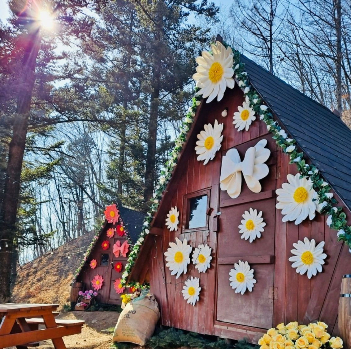 곤지암반디숲은 서울에서 40분, 곤지암리조트에서 5분거리로 접근성 뿐만 아니라 가성비가 으뜸이라 주말이면 주차장이 붐빌 수 있으니 일찍 서두르시면 좋다. 숲속에는 꽃단장한 캐빈들이 있는데 이곳이 반디숲에서 빼놓을 수 없는 포토존이다